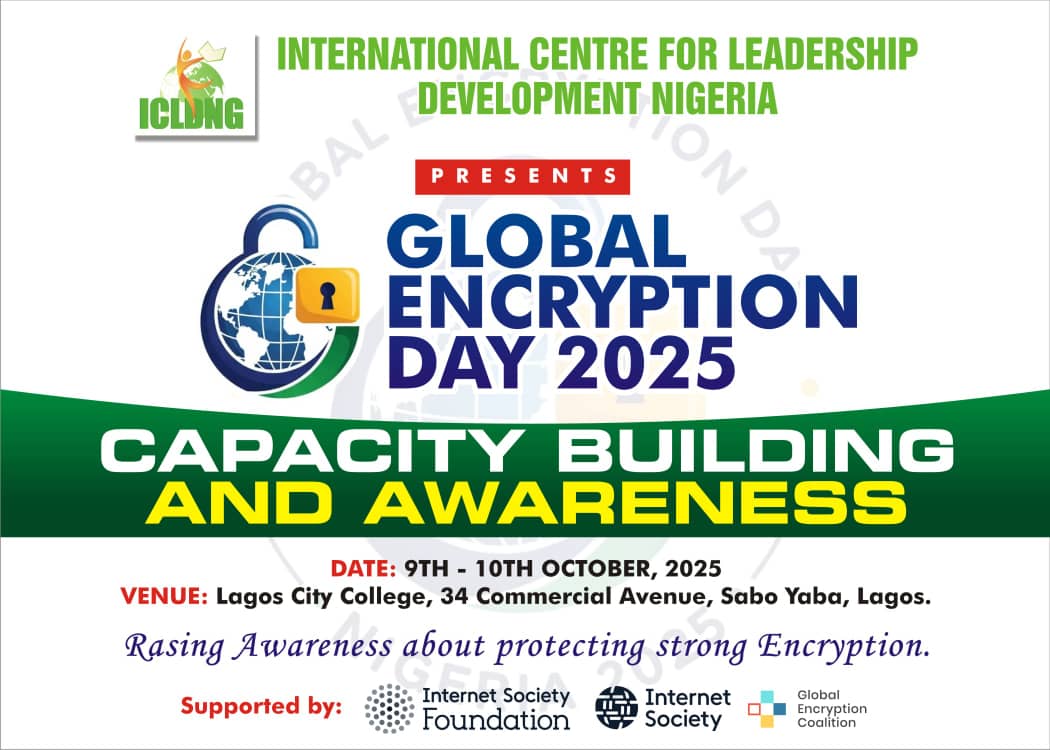 We’re proud to announce that Global Encryption🔐 Day 2025 will take place on 🗓October 9–10, 2025, at Lagos City College Sabo Yaba lagos State and NIIT Port Harcourt, Rivers State on the 31 October, 2025 Organized by the International Centre for Leadership Development Nigeria (ICLDNG), with support from the Internet Society Internet Society Foundation,, and […]